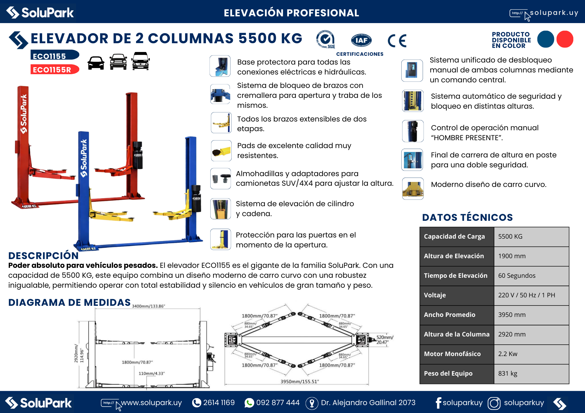 Elevador de dos columnas con doble cadena hidráulica y doble traba de seguridad MANUAL. Fácil accionar, bajo consumo de energía y bajo nivel de ruido.
